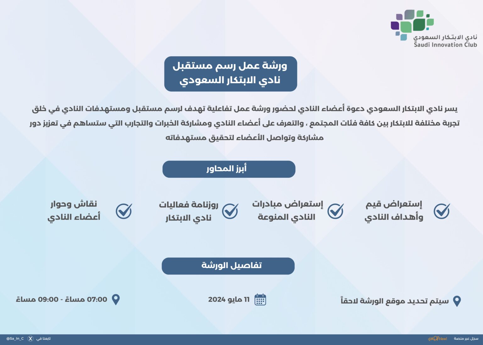 نادى الابتكار السعودي مجتمع ابتكاري يعزز هواية الابتكار ويدعم المهتمين من جميع فئات المجتمع من خلال نشر المعرفة وتشجيع ثقافة الابتكار والابداع من خلال بيئة لتباديل الخبرات وتنمية المهارات